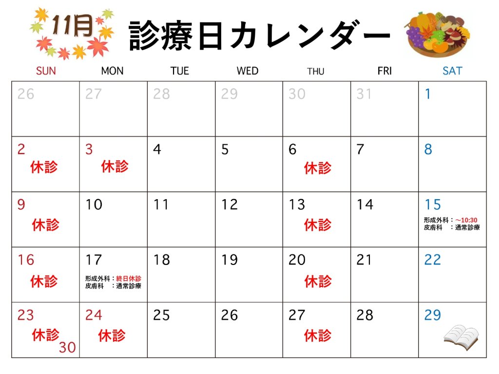 【🗓️11月診療時間変更のご案内】 一部変更がありますのでカレンダーをご確認ください。 皆様にはご不便をおかけいたしますが、何卒よろしくお願いいたします。 【✨️お知らせ✨️】 このたび、形成外科の診療枠が拡大し「14:00までご予約が可能」となり、 より多くの患者様に受診いただけるようになりました。ご予約お待ちしております