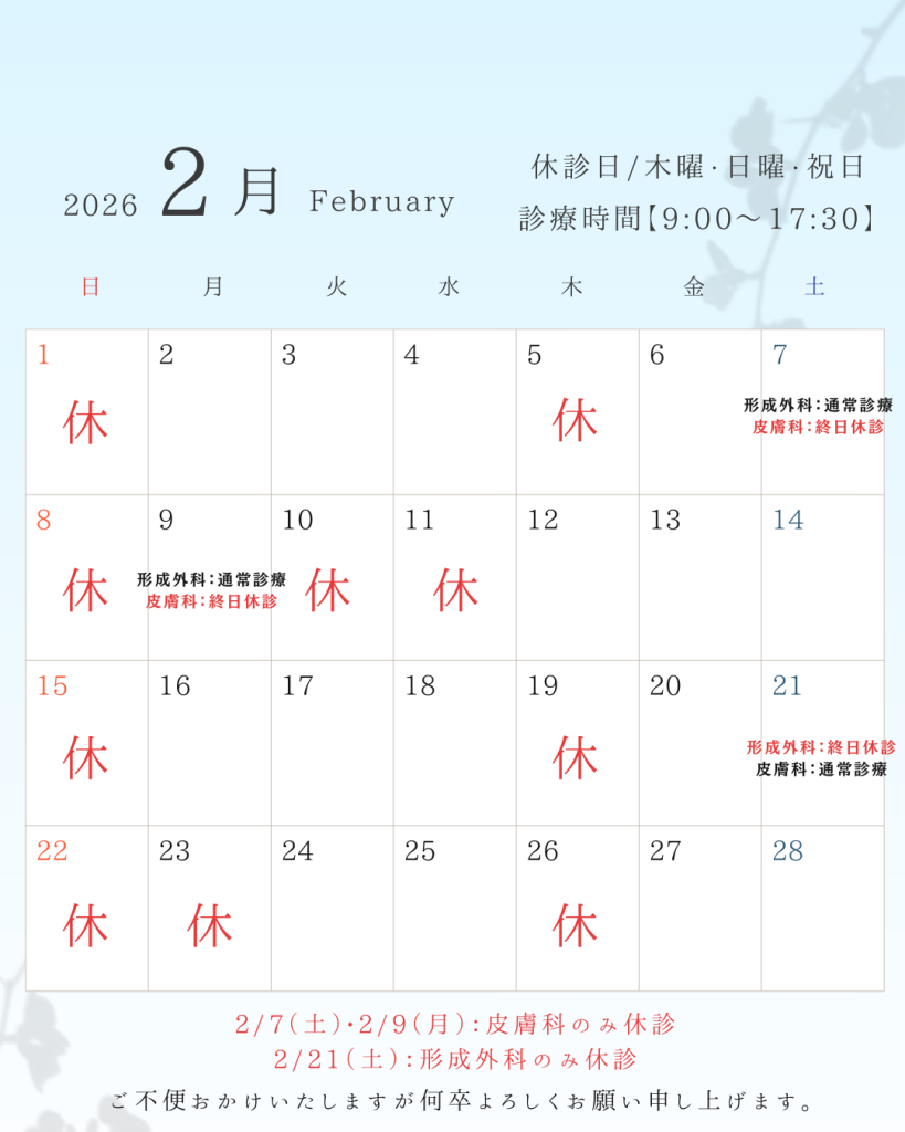 ■ 診療科別 休診日のお知らせ ・2/7 (土)・2/9(月):皮膚科 休診 ・2/21(土):形成外科 休診