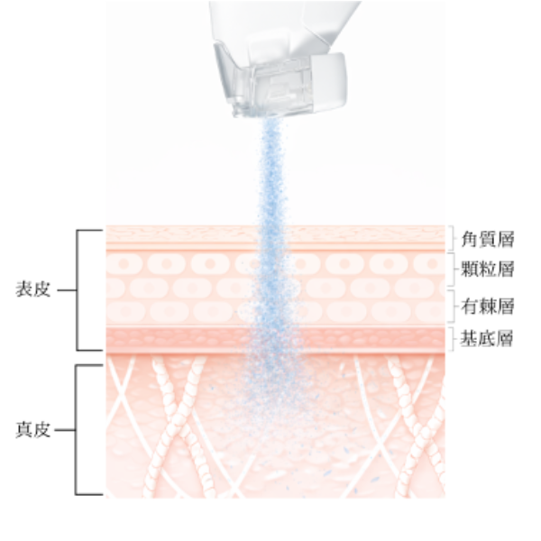 “アイスニードリング”は、針を使わずに薬剤導入を可能にする技術です。高圧のCO₂(二酸化炭素)冷媒を高速ジェットで噴射し、微細な“氷の針”をつくり出し、肌表面に微細な刺激を与えることで、有効成分を真皮浅層〜中層へまで拡散させます。